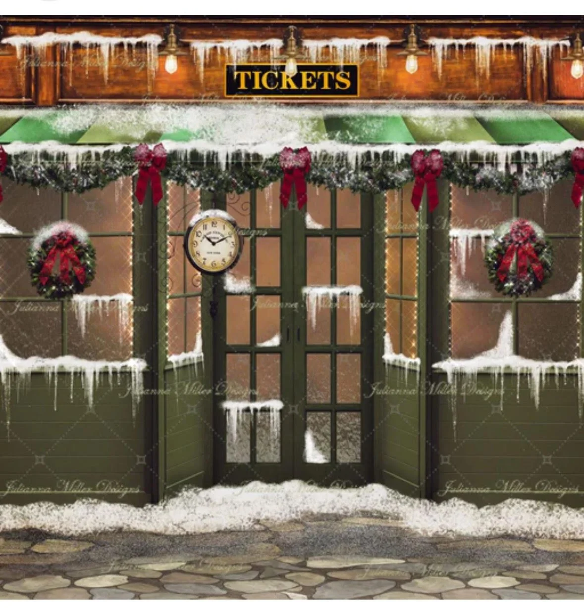 Thick fabric backdrop features a ticket station at Grand Central in New York at Christmas
